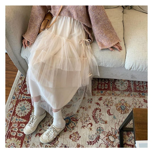 Flower Embroidered Mesh Midi A-Line Skirt