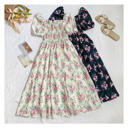 Square-Neck Puff-Sleeve Ruched Floral A-Line Dress