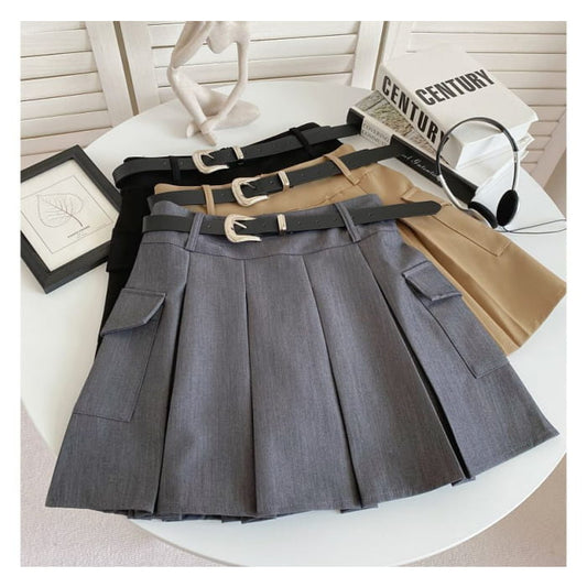 Set: High Waist Plain Pleated Mini A-Line Cargo Skirt + Faux Leather Belt