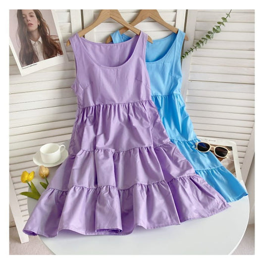 Sleeveless Scoop Neck Plain Tiered A-Line Dress