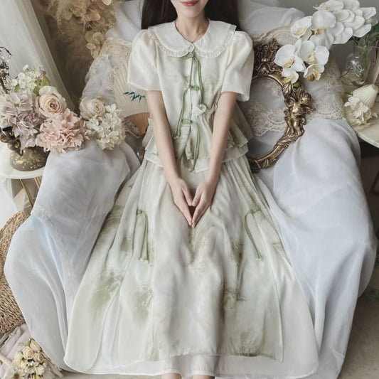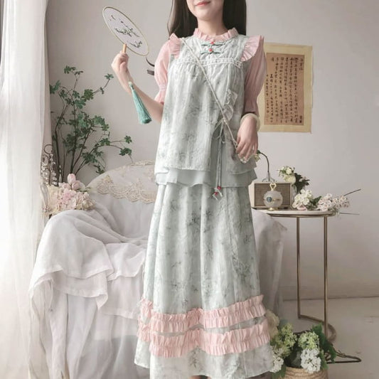 Set: Bell-Sleeve Mandarin Collar Midi A-Line Dress + Floral Embroidery Frog Button Crop Vest