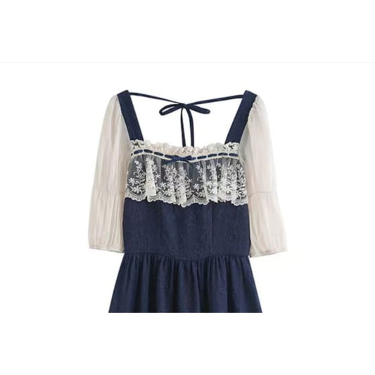 Puff-Sleeve Flower Embroidered Lace Trim Midi A-Line Dress