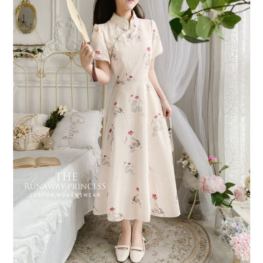 Puff Sleeve Mandarin Collar Floral Print Midi A-Line Dress