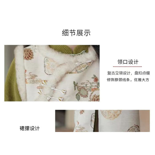 Set: Long-Sleeve Band Collar Embroidered Midi Qipao + Sleeveless Embroidered Midi Dress