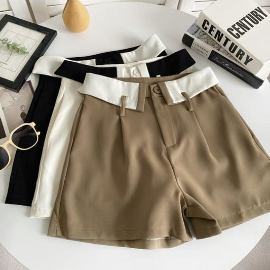 Set: V-Neck Contrast Trim Cable Knit Sweater + High Waist Wide Leg Shorts