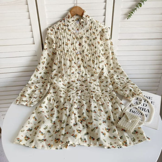 Long-Sleeve Floral Frill Trim Button A-Line Dress