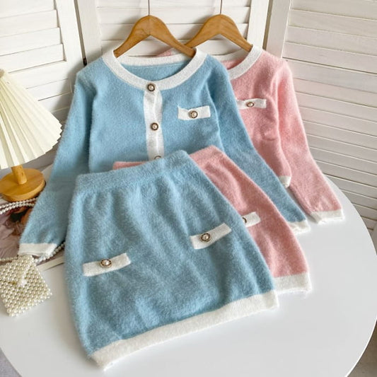 Set: Crew Neck Contrast Trim Button-Up Crop Cardigan + High Waist Mini Pencil Knit Skirt