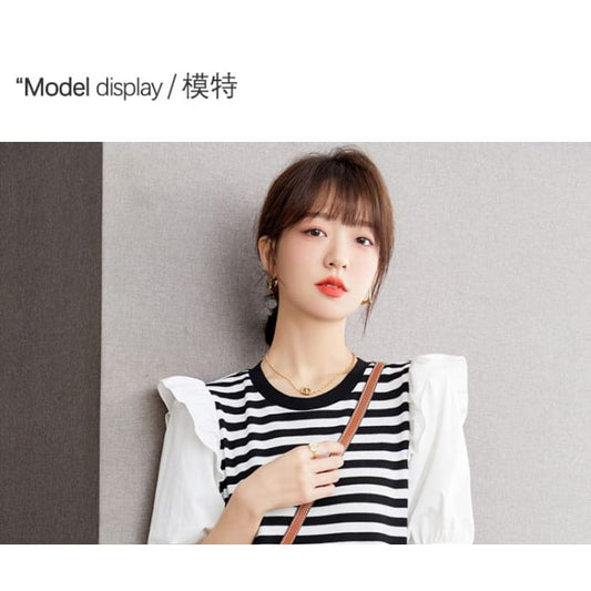 Short-Sleeve Round Neck Striped Panel Ruffle Trim Mini A-Line Dress