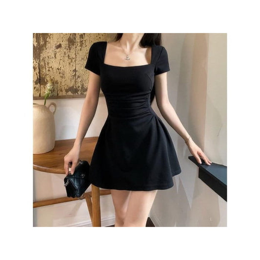 Short-Sleeve Square Neck Plain Ruched Mini A-Line Dress