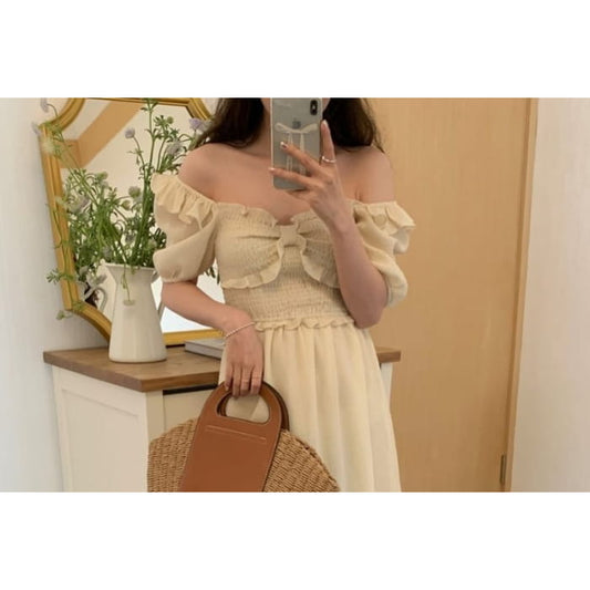 Short-Sleeve Plain Ruffle Midi A-Line Dress