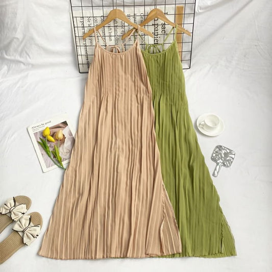 Spaghetti Strap Scoop Neck Plain Midi Pleated Dress