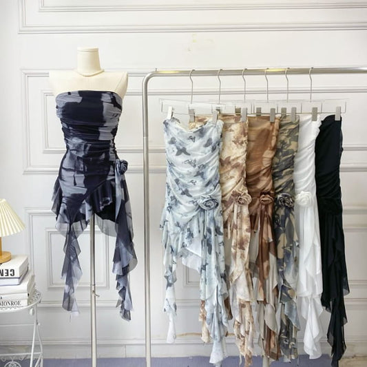 Patterned Print Flower Detail Ruched Asymmetrical Mini Sheath Tube Dress