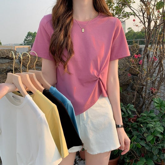 Short-Sleeve T-Shirt Plain Neck Crew Asymmetrical Crop Ruched
