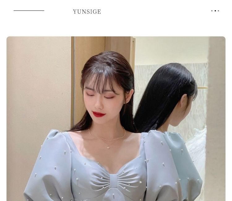 Puff-Sleeve Plain Faux Pearl A-Line Evening Gown