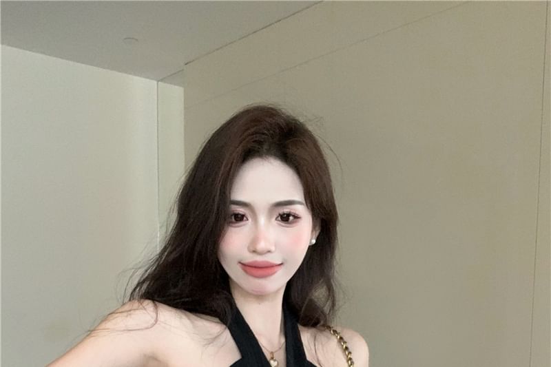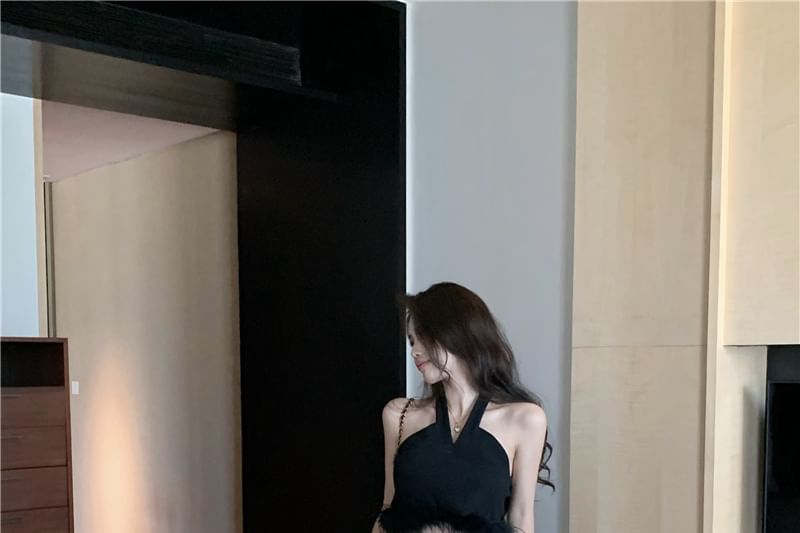 Halter Plain Feather Trim Crop Top / High Waist Plain Pleated Maxi A-Line Skirt