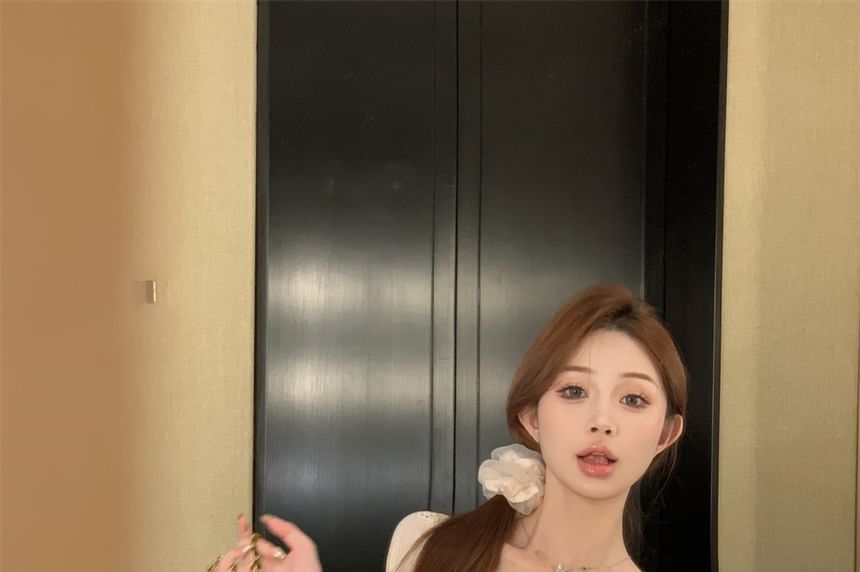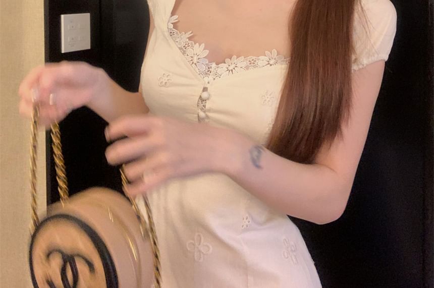 Short-Sleeve Square-Neck Floral Trim Mini A-Line Dress