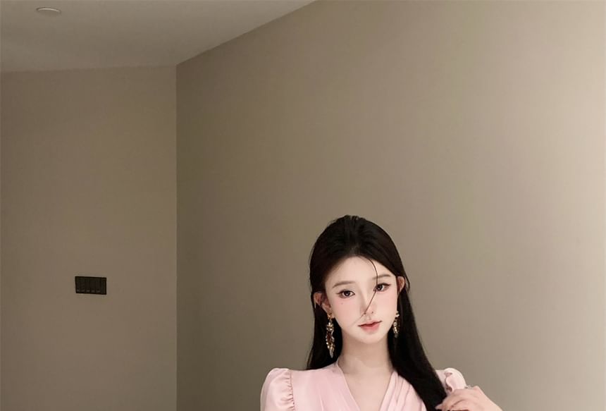 Applique Rise Skirt Mini Plain Sleeve / V-Neck Crop Floral Pencil Blouse High Long Ruched