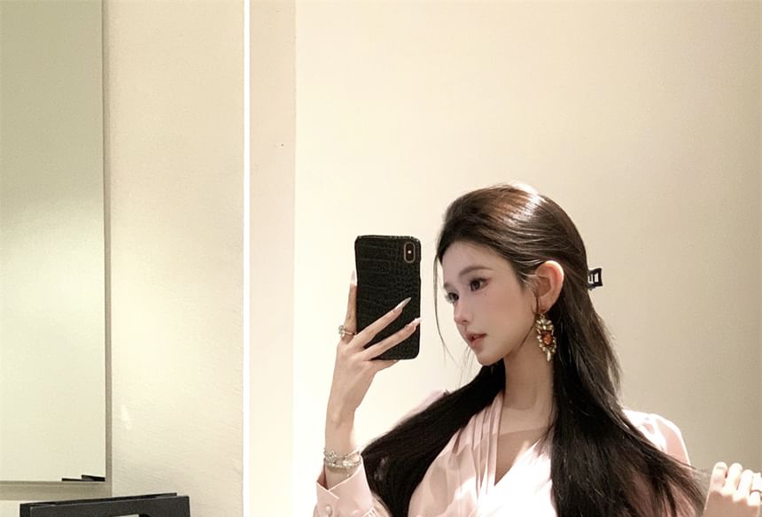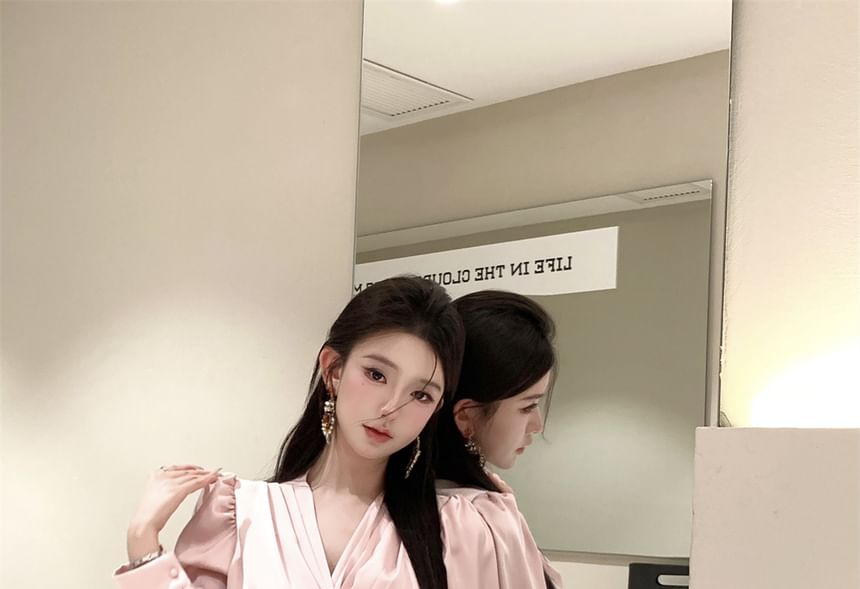 Long Sleeve V-Neck Plain Ruched Crop Blouse / High Rise Floral Applique Mini Pencil Skirt
