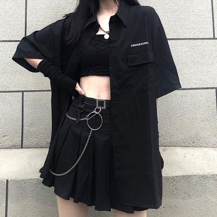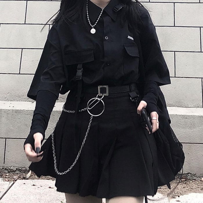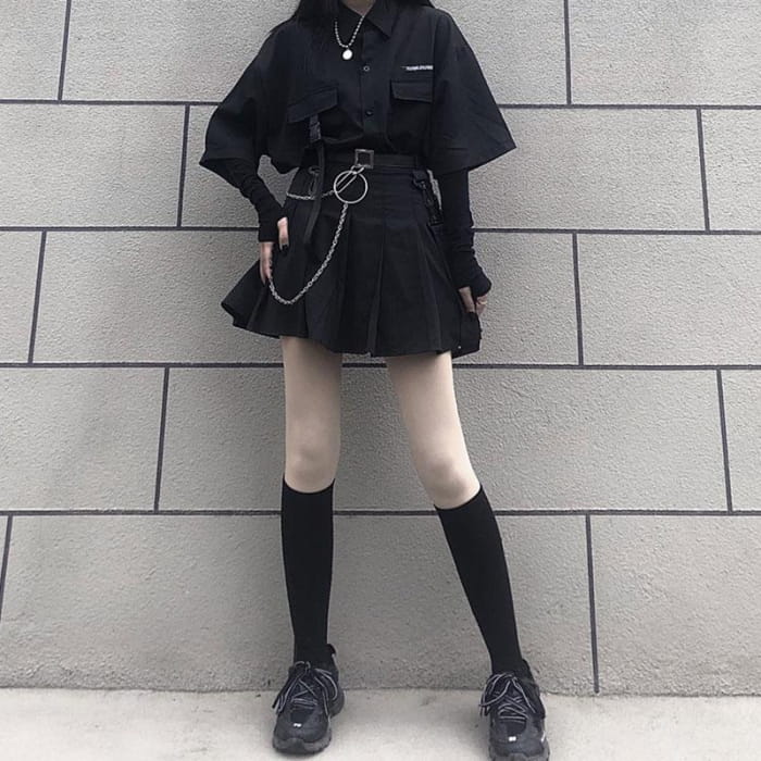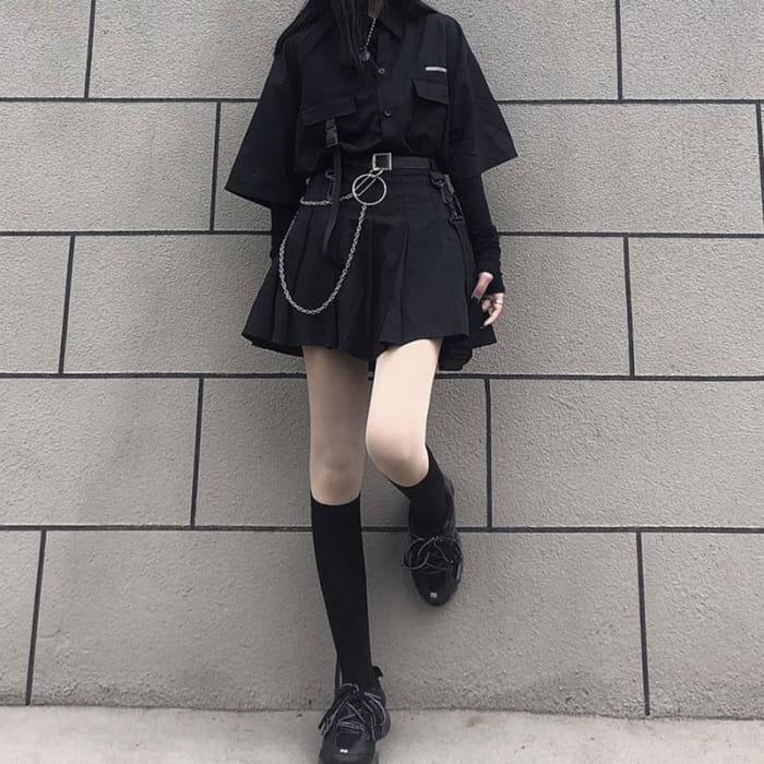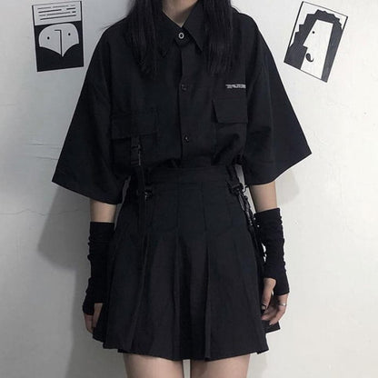 Elevate your wardrobe with our Black Dark Pocket T-Shirt Skirt Set. Designed in elegant black, this set features a stylish pocket detail on the t-shirt and a matching skirt for a complete look. Perfect for any occasion, this set offers both style and convenience in one chic package.