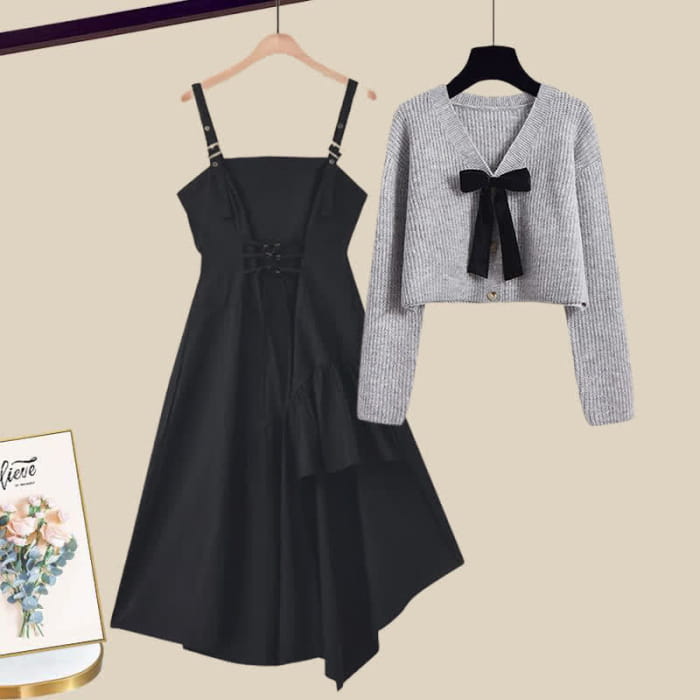 Bow Knot Cardigan Sweater Lace Up Irregular Slip Dress Set
