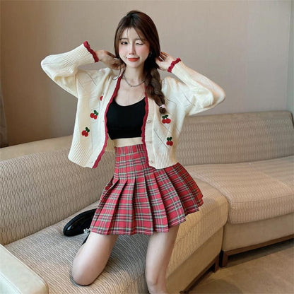 Indulge in elegance with our Cherry Embroidery Sweater Plaid Skirt Set. This charming ensemble features delicate cherry embroidery on a cozy sweater, paired with a classic plaid skirt for a sophisticated look. Perfect for any occasion, this set will elevate your wardrobe with its timeless style.