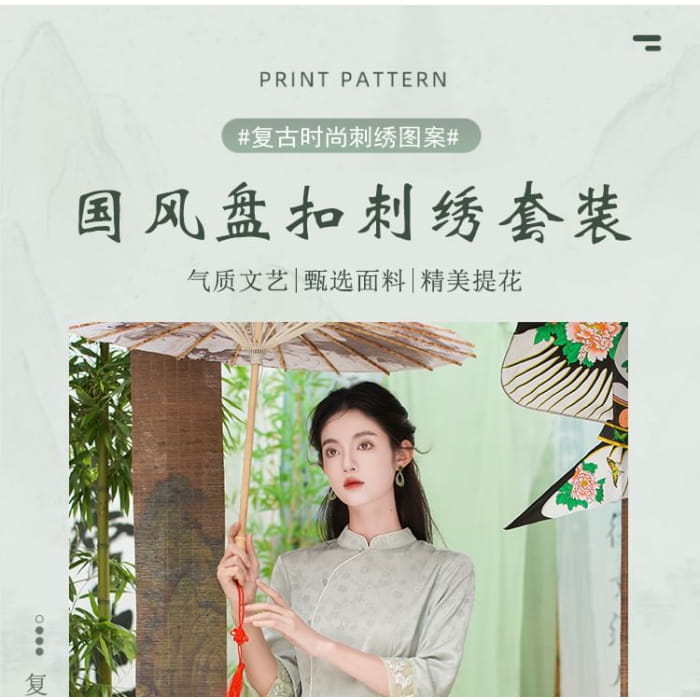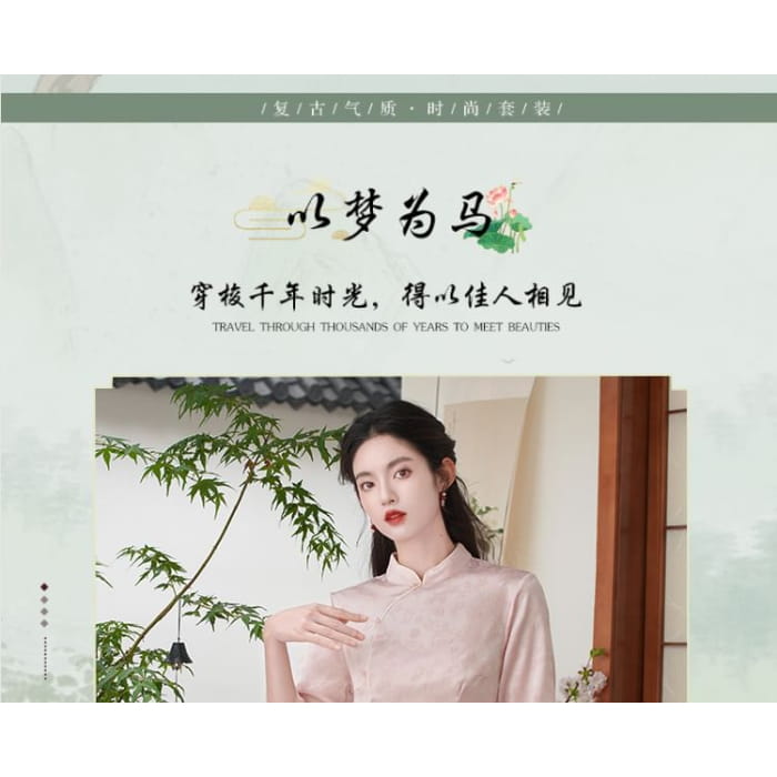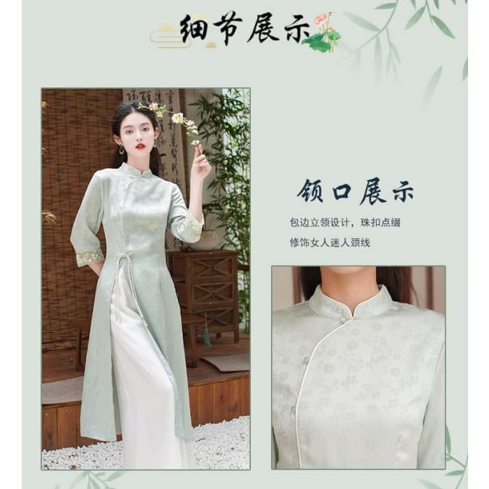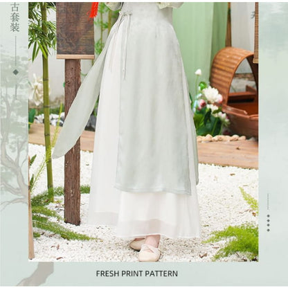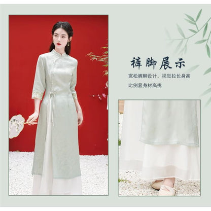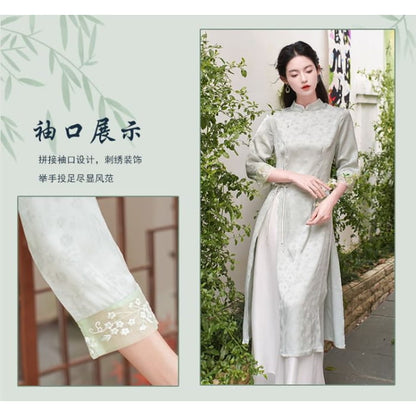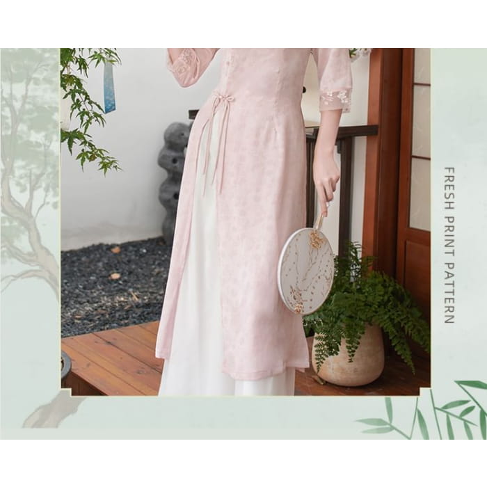 Elbow-Sleeve Floral Side-Slit Midi Hanfu Dress / High Waist Plain Wide Leg Pants / Set