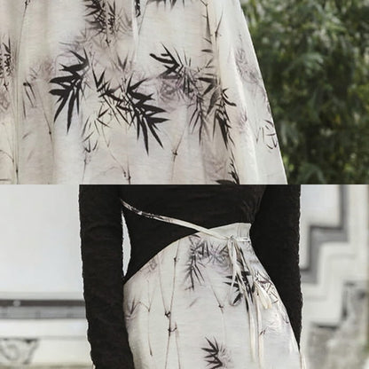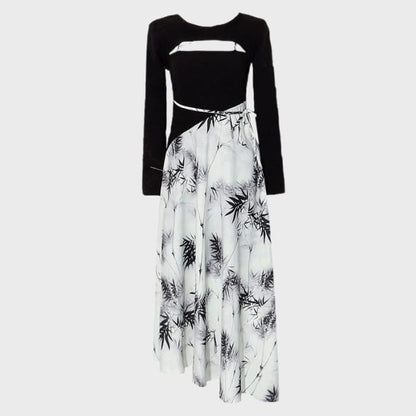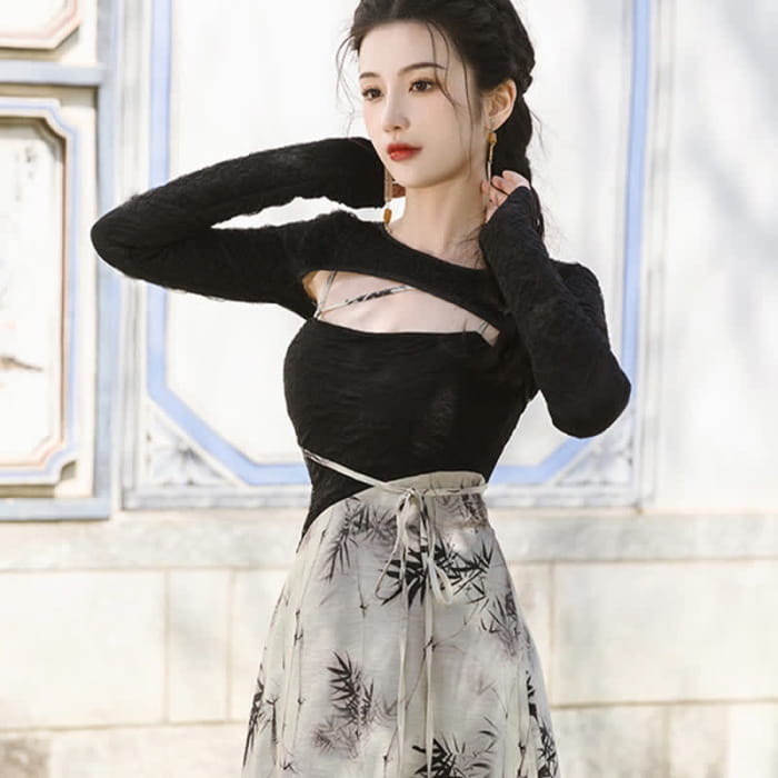 Elegant Bamboo Print Lace Up Slip Dress Long Sleeve Top