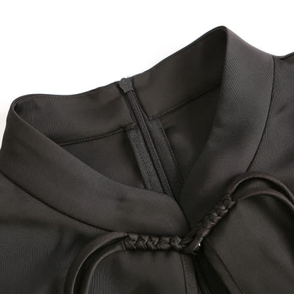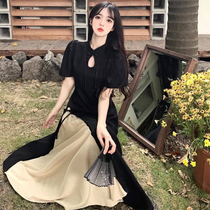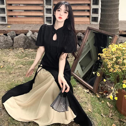 Elegant Black Buckle Split A-line Cheongsam Dress
