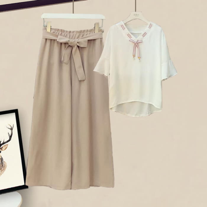 Transform your style with our Elegant Bowknot Chiffon T-Shirt and Lace Up Wide Leg Pants. Made with high-quality chiffon material, the bowknot detailing adds an elegant touch to this outfit. The lace-up design on the pants is not only stylish, but also allows for a comfortable and adjustable fit. Elevate your wardrobe with this elegant ensemble.