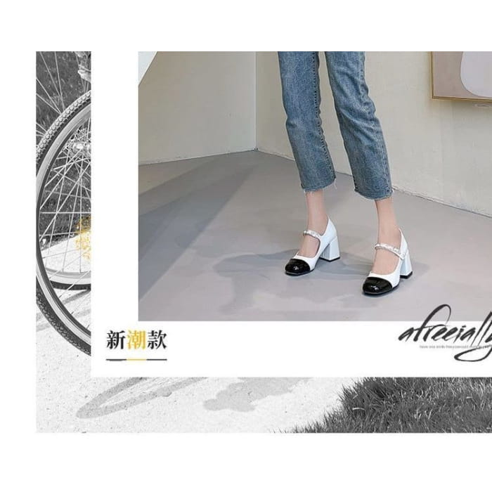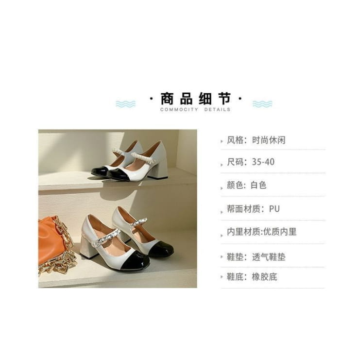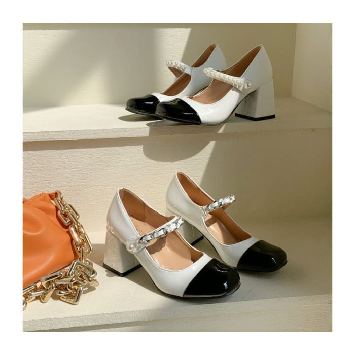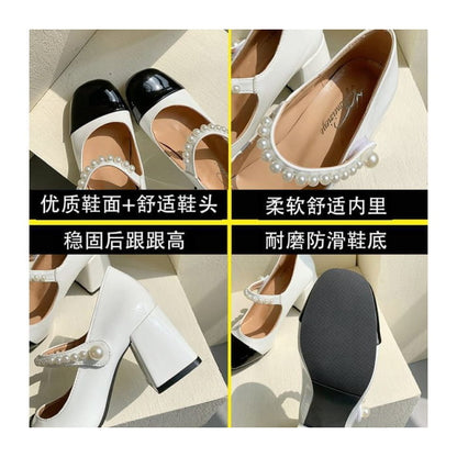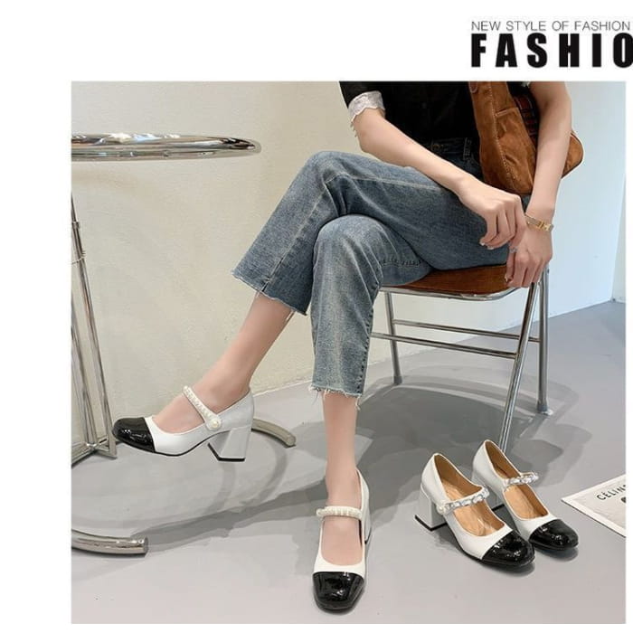 Faux Pearl Cap-Toe Chunky-Heel Mary Jane Pumps