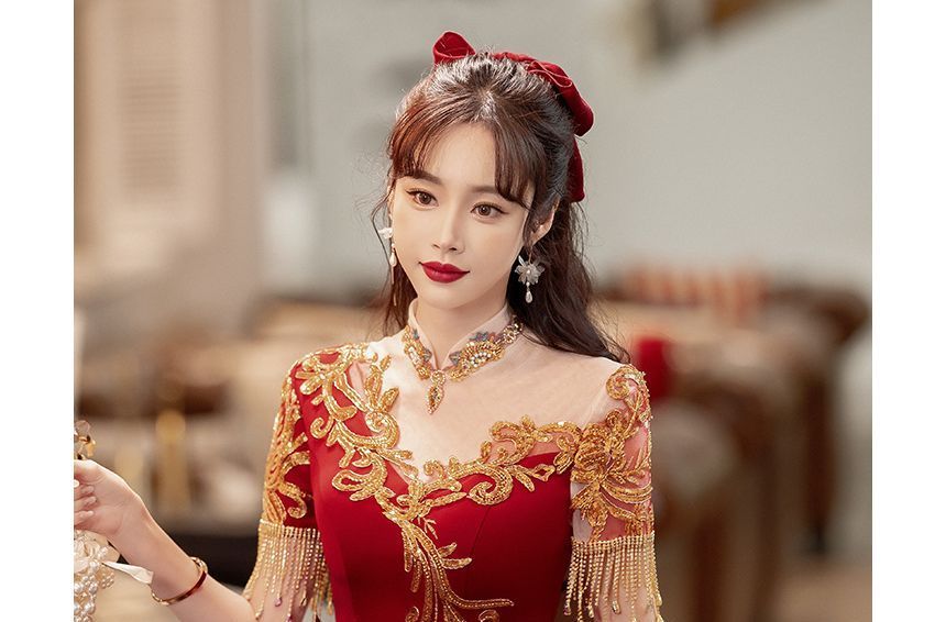 Fringed Dress / Evening Sequin Gown Midi Short-Sleeve A-Line