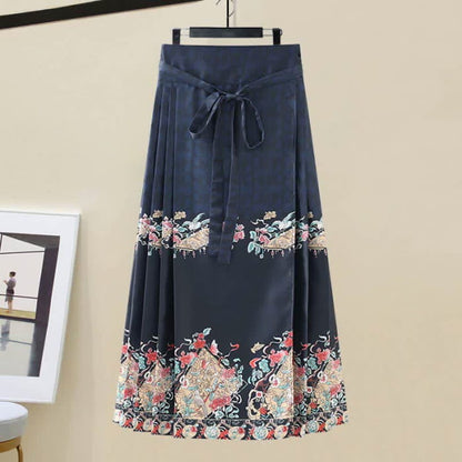 Enhance your wardrobe with our Graceful Hanfu Buckle T-Shirt and Lace Up Graphic Print Pleated Skirt. Featuring a stunning, elegant design, this outfit is perfect for any occasion. The buckle detail and lace up closure add a touch of charm, while the graphic print and pleated skirt provide a unique, stylish look. Elevate your style with this graceful and fashionable ensemble.
