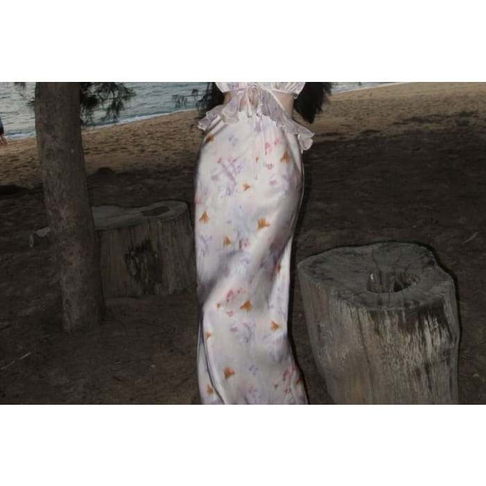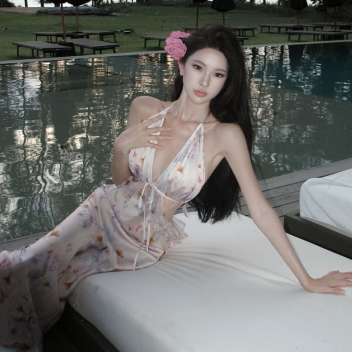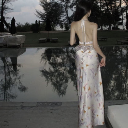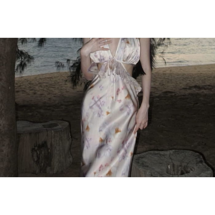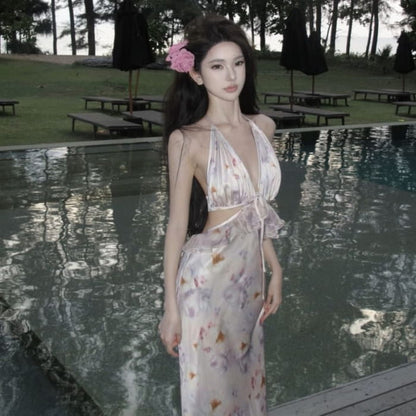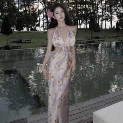 Halter Floral Open Back Cutout Maxi Bodycon Dress