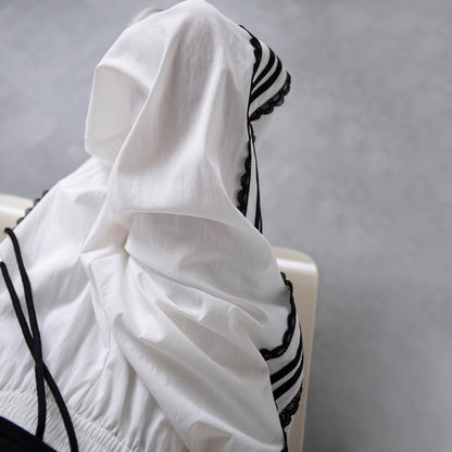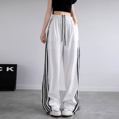 High Waist Lace-Trim Striped Loose-Fit Wide-Leg Sweatpants