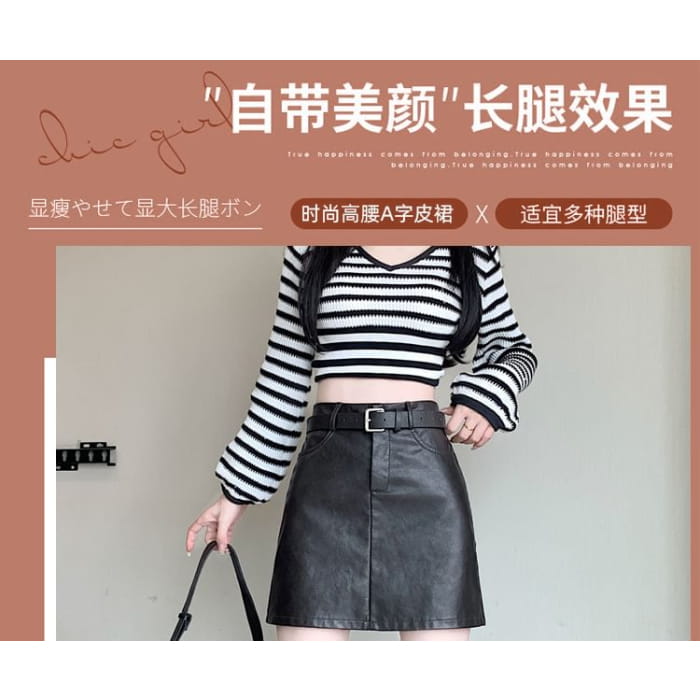 High Waist Plain Faux Leather Mini A-Line Skirt