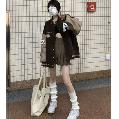 Letter Embroidery Baseball Jacket Pleated Skirt Set