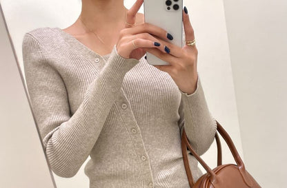 Long-Sleeve Asymmetrical Neckline Button-Up Knit Top
