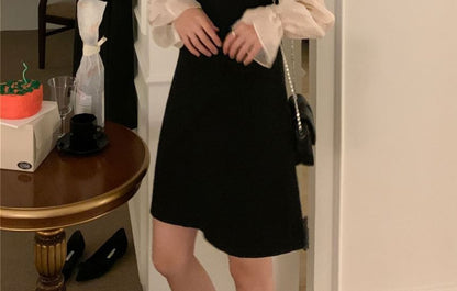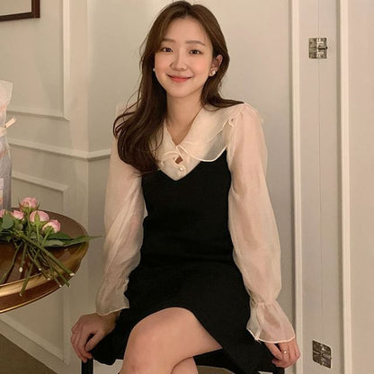 Long-Sleeve Collared Blouse / V-Neck Plain Mini A-Line Dress