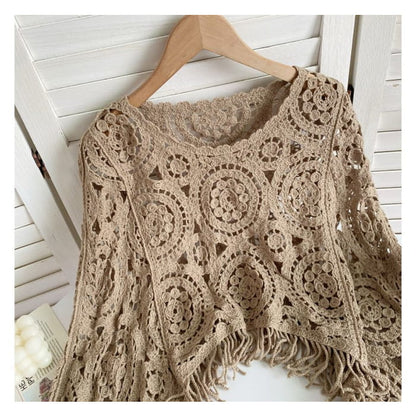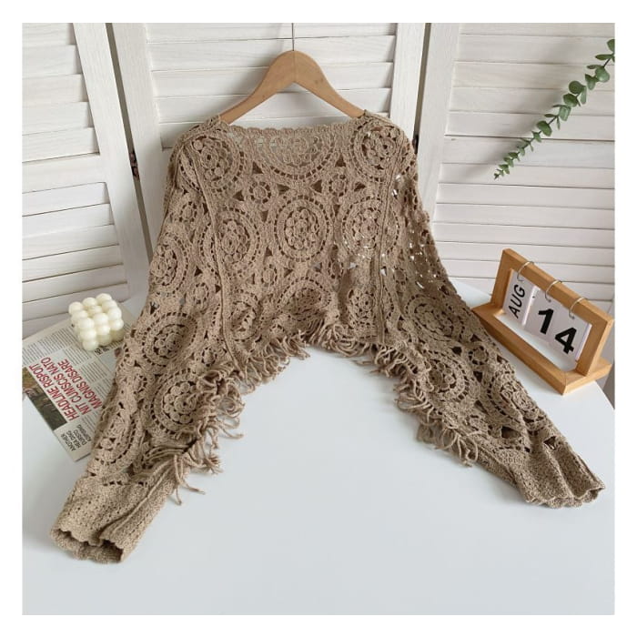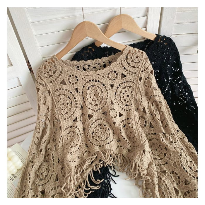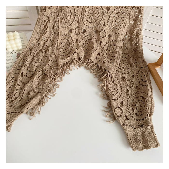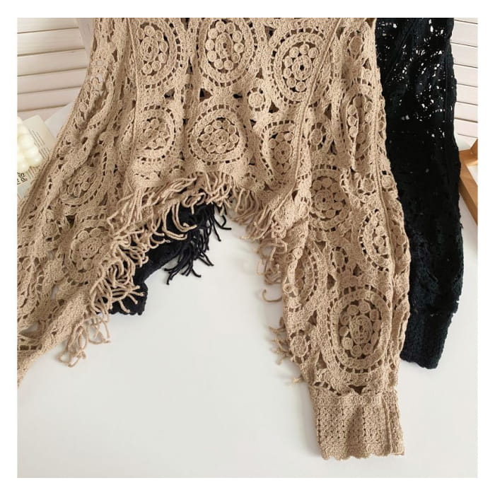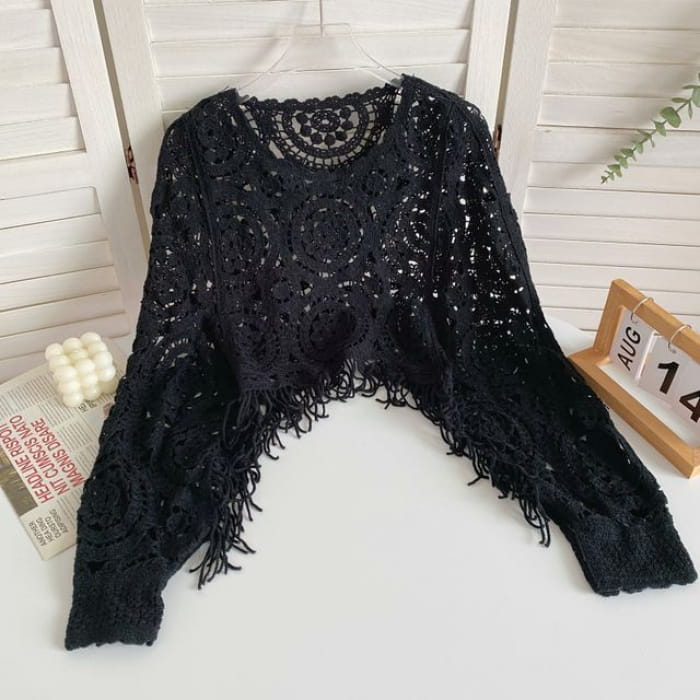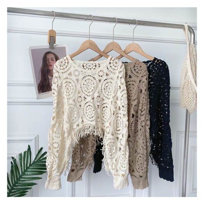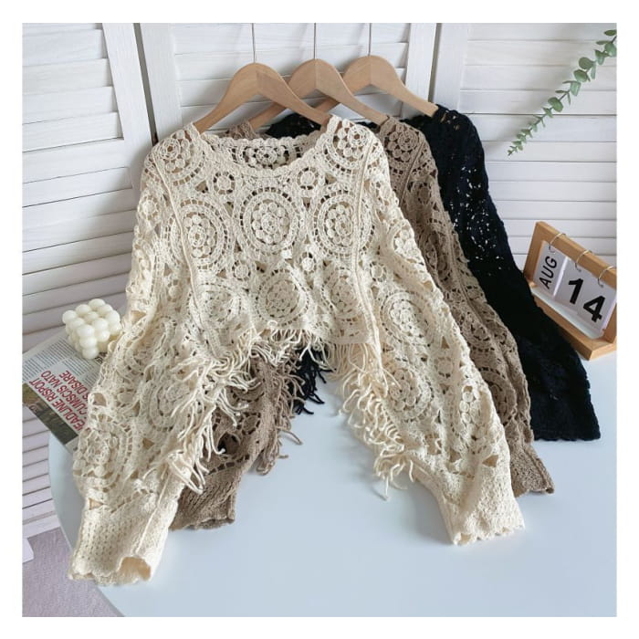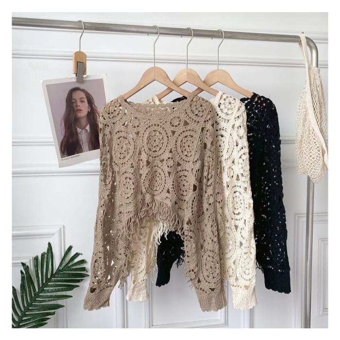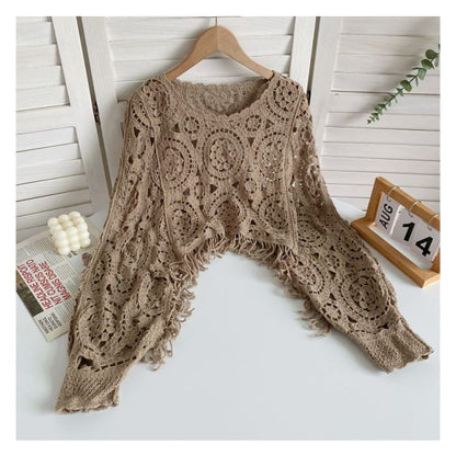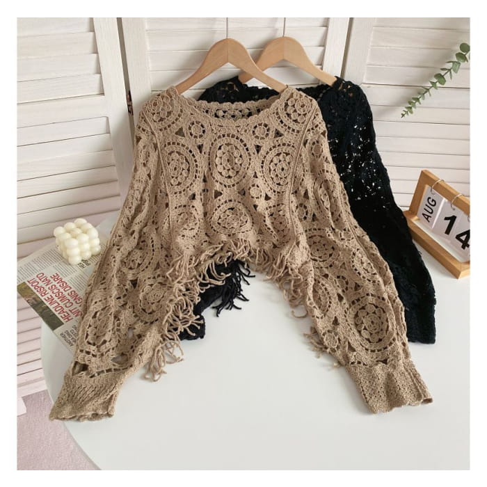 Long-sleeve Crew Neck Asymmetrical Tasseled Crop Pointelle Knit Top