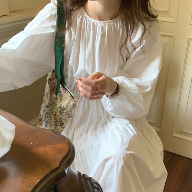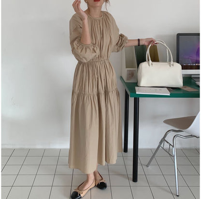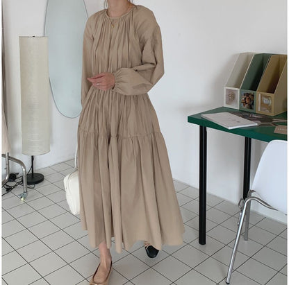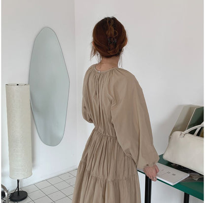 Long-Sleeve Crew Neck Plain Tiered Midi A-Line Dress