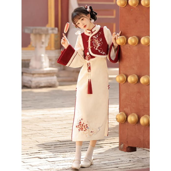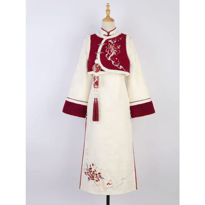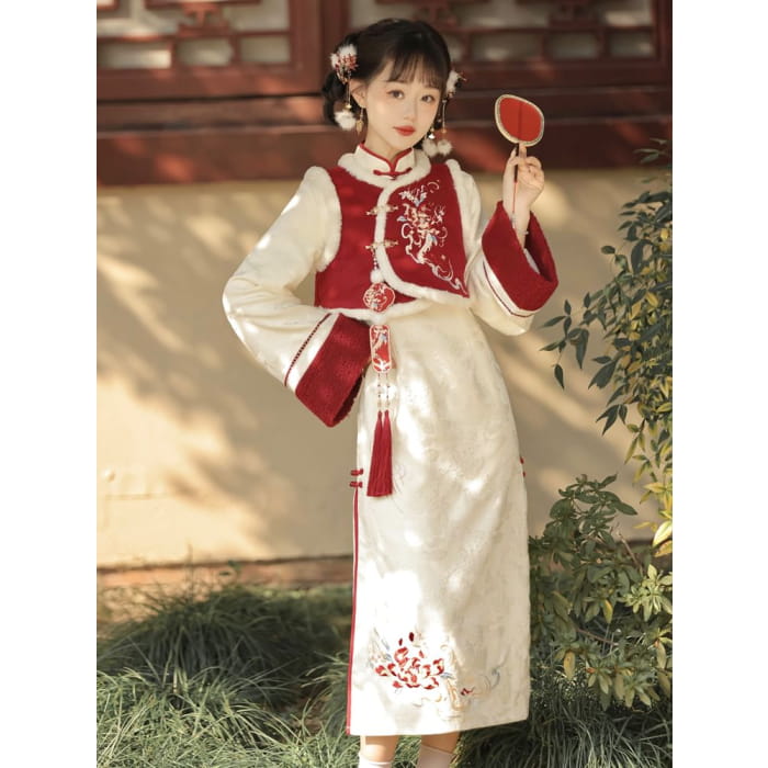 Long-Sleeve Lolita Floral Embroidered A-Line Qipao / Round Neck Fluffy Trim Buckle Vest / Tassel Charm / Set