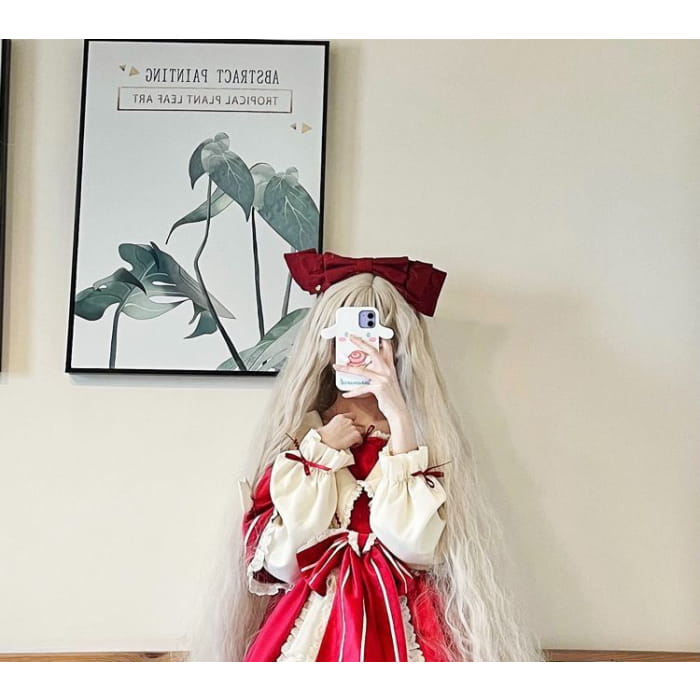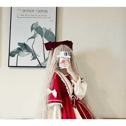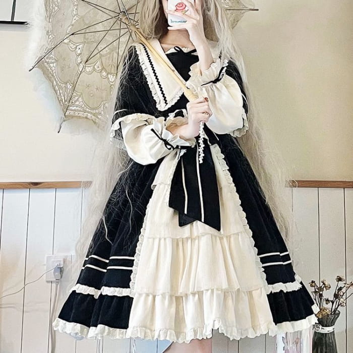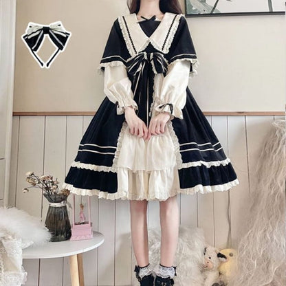 Lolita Long-Sleeve Mock Two-Piece Lace Trim A-Line Dress / Headpiece / Set