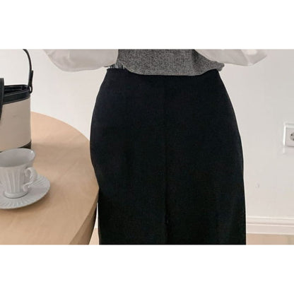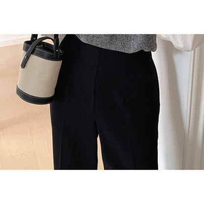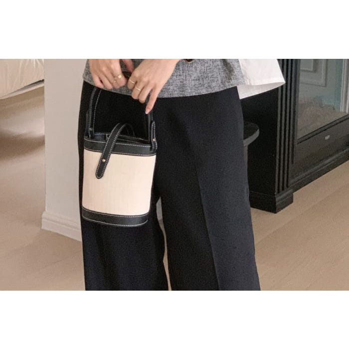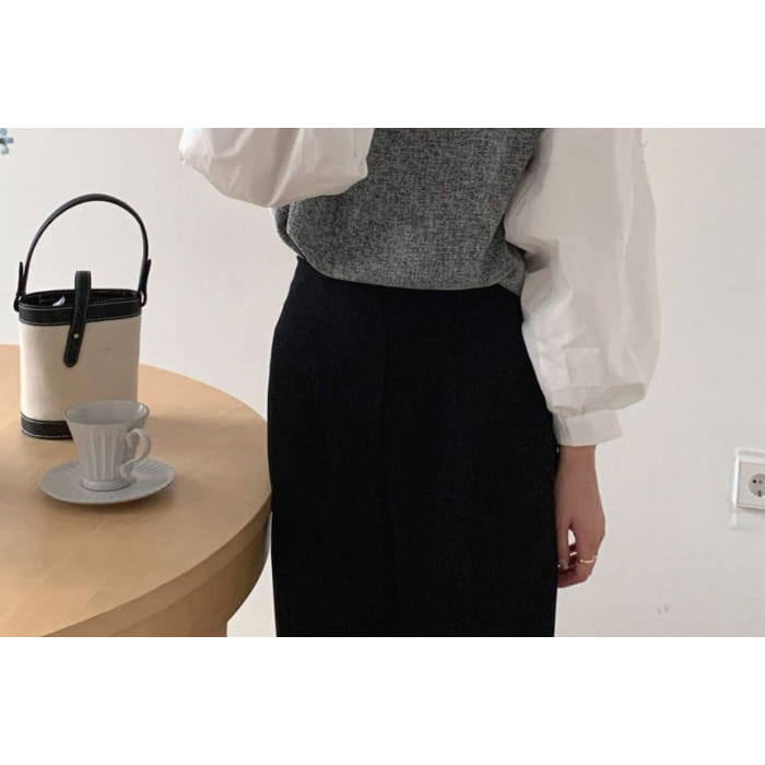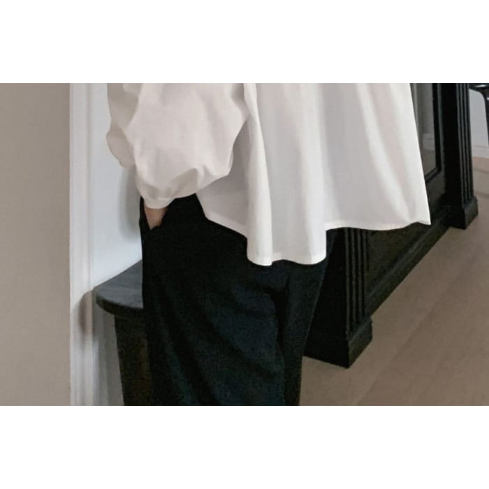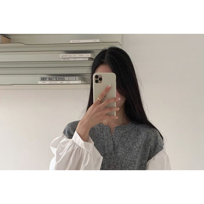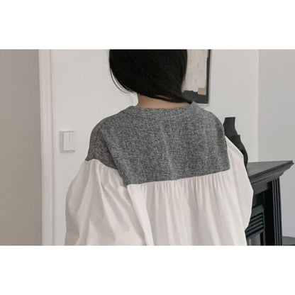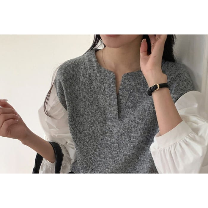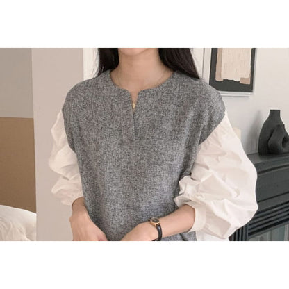 Long-Sleeve Notch Neck Melange Panel Blouse