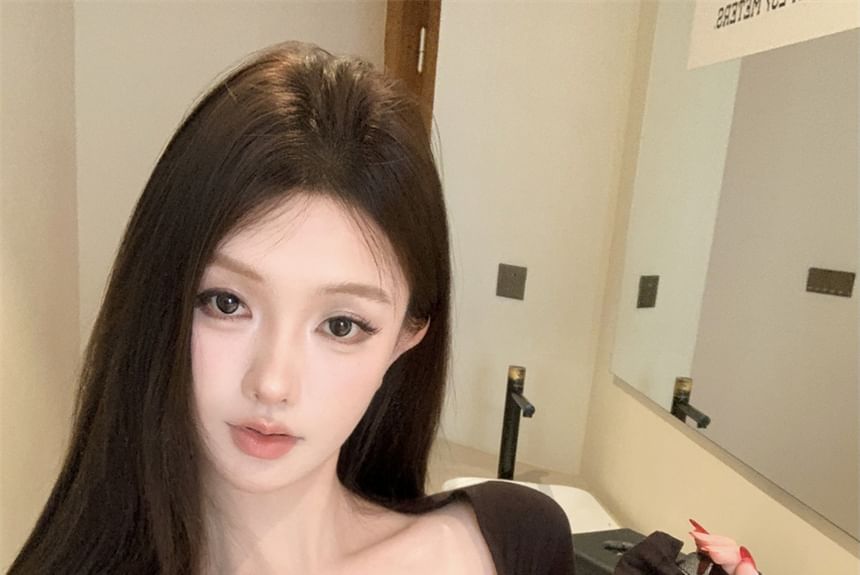 Cold-Shoulder Long-Sleeve Plain Lace-Up T-Shirt