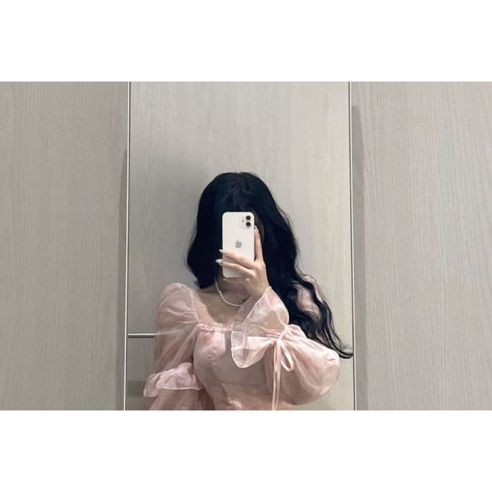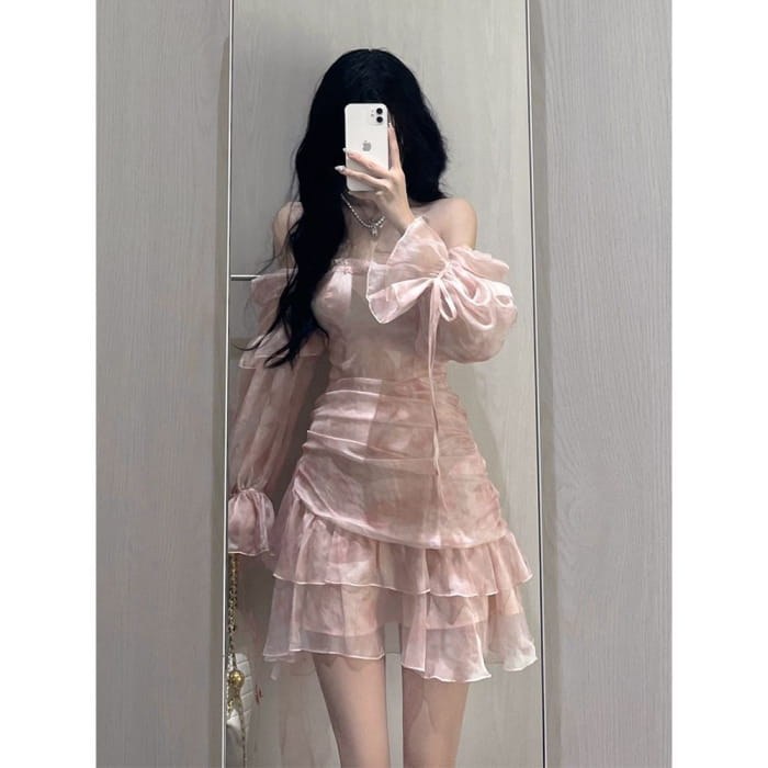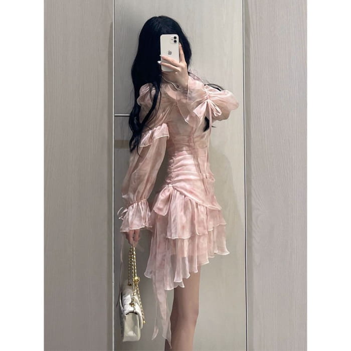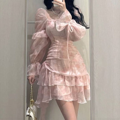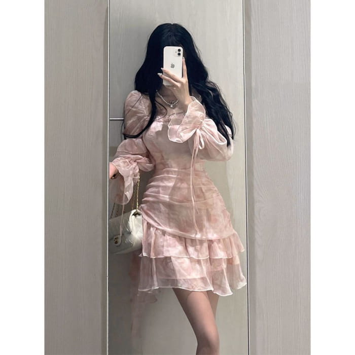Long-Sleeve Square Neck Floral Mini A-Line Dress