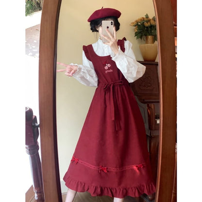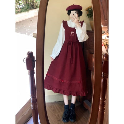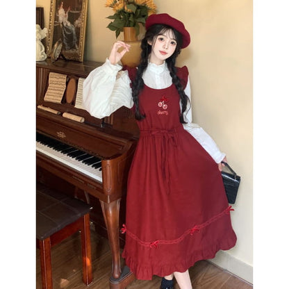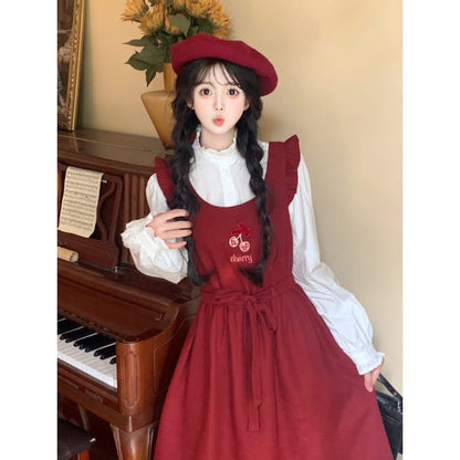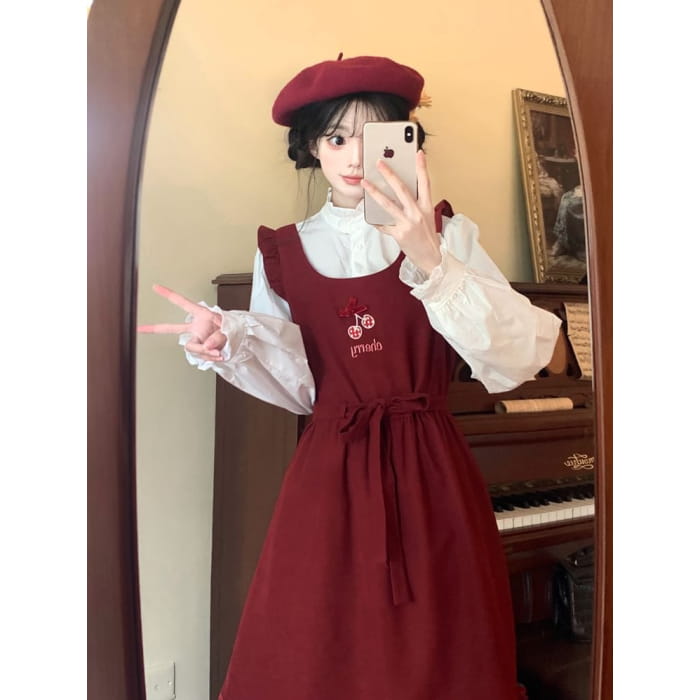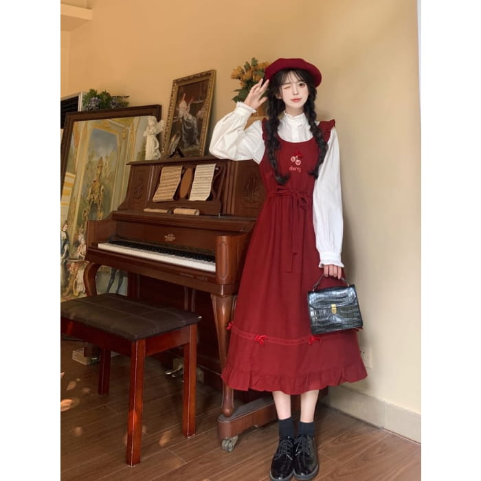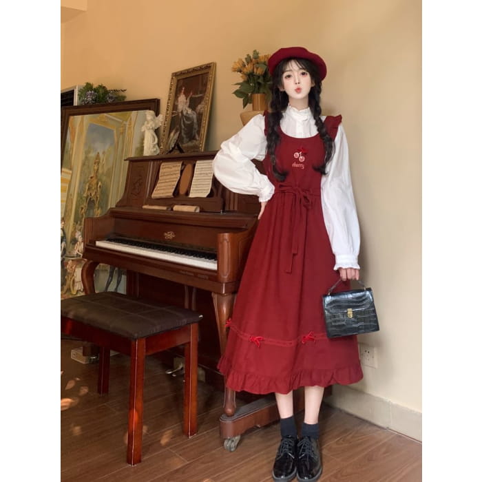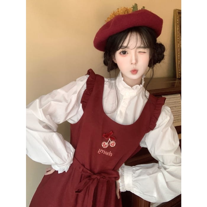 Long Sleeve Stand Collar Plain Frill Blouse / Cherry Embroidered Bow Ruffle Midi A-Line Overall Dress