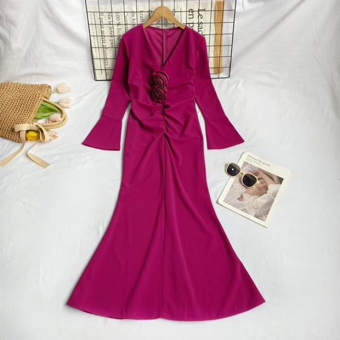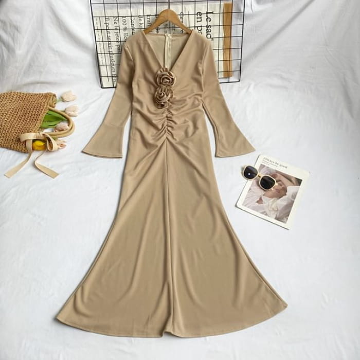 Long-Sleeve V-Neck Plain Flower Accent Ruched Midi A-Line Dress