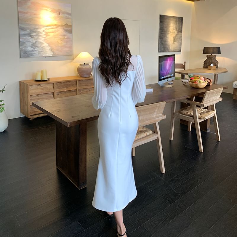Long-Sleeve V-Neck Plain Flower Accent Slit Midi Sheath Dress