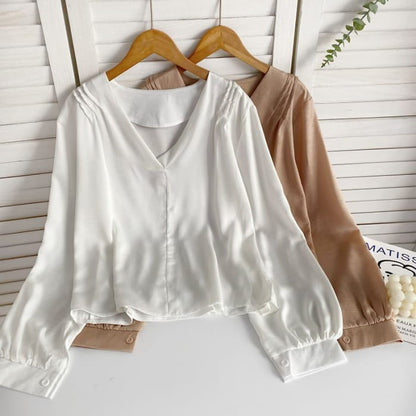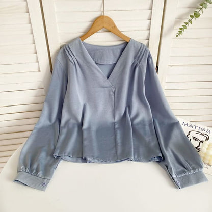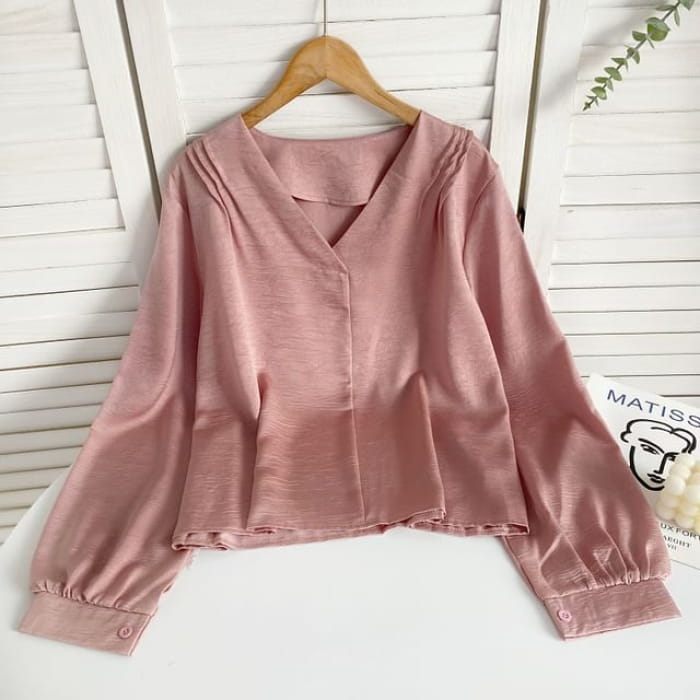 Long-Sleeve V-Neck Plain Pintuck Blouse