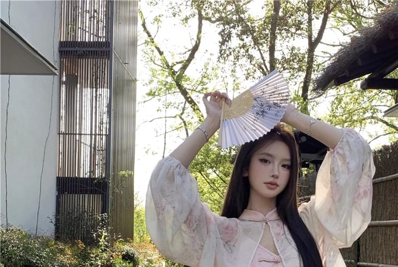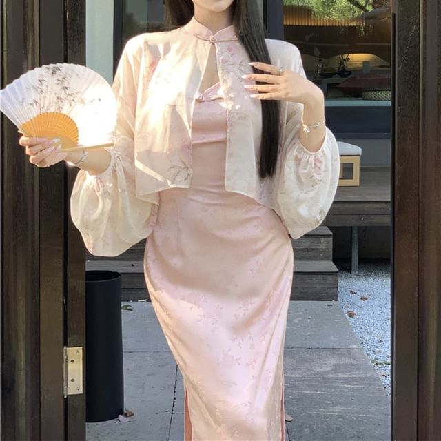 Mandarin Frog Slit Collar Maxi Print Jacket Light V-Neck Floral Jacquard Dress / Strap Sheath Closure Spaghetti